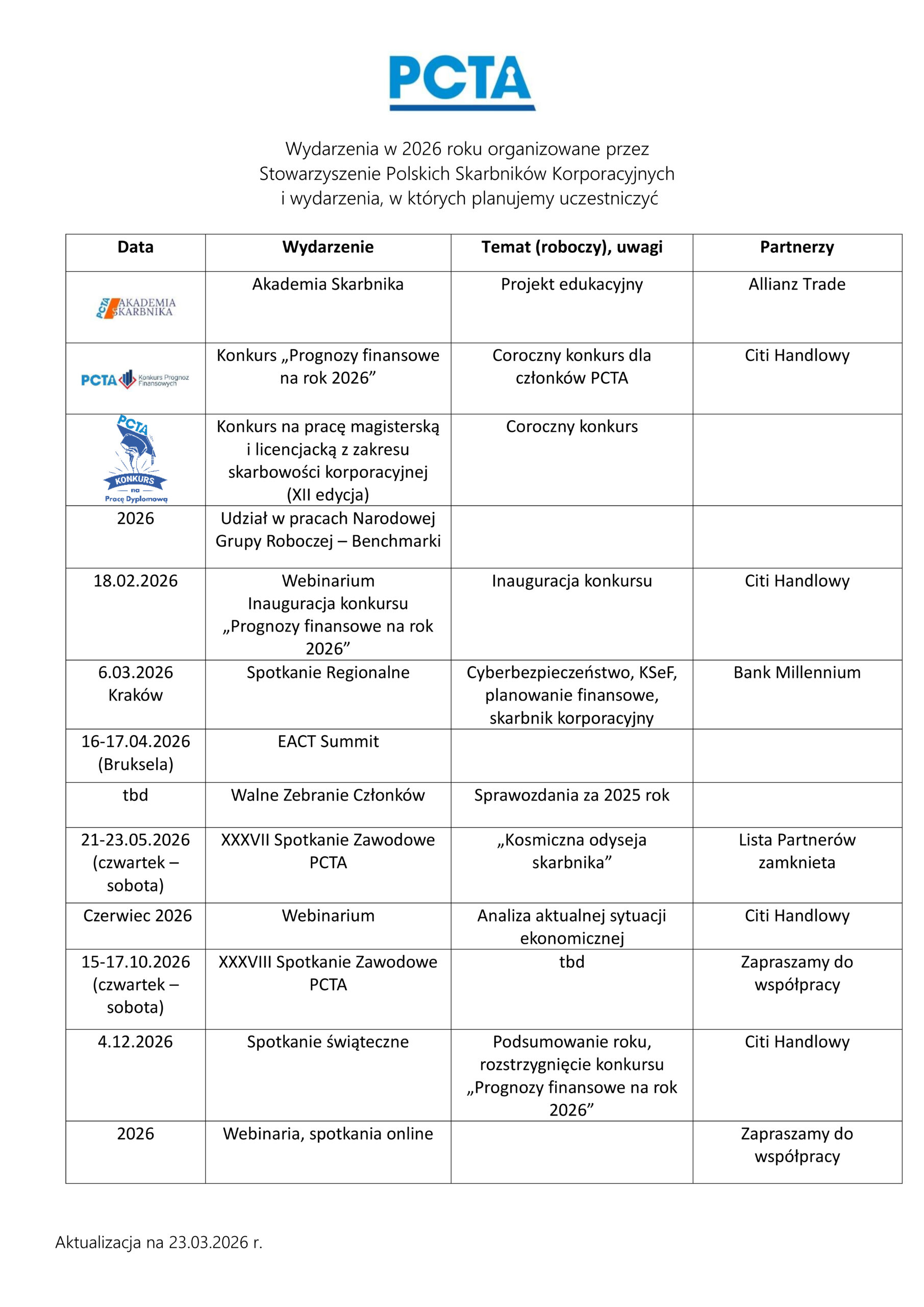 Plan wydarzeń PCTA na 2026 rok utworzone przez Anna Augustynowicz (admin) | gru 2, 2025 ← Spotkanie świąteczne 5.12.2025 Inauguracja Konkursu „Prognozy finansowe na rok 2026” →
